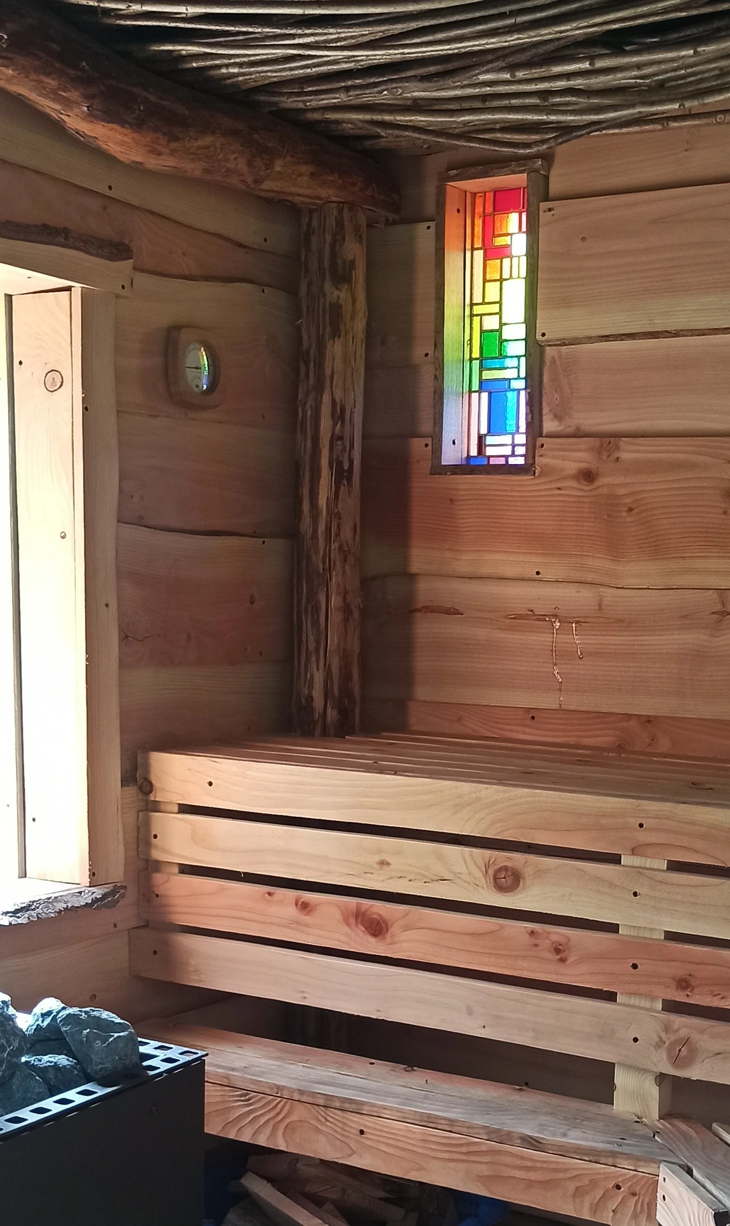 Featuring a bespoke stained glass window, locally sourced Douglas Fir cladding, and a roundwood frame and stick ceiling, this is a truly unique and high performance, and affordable sauna.