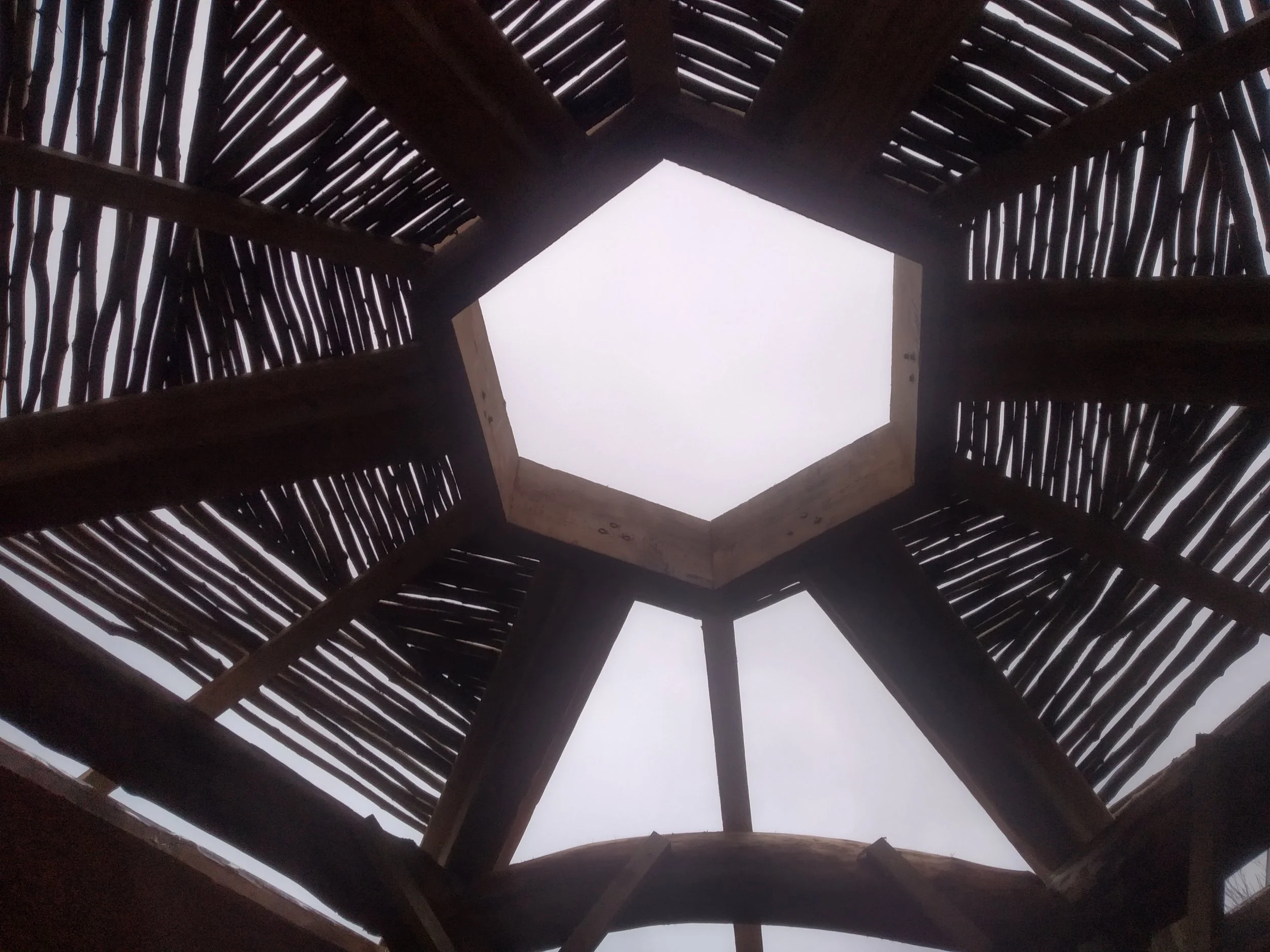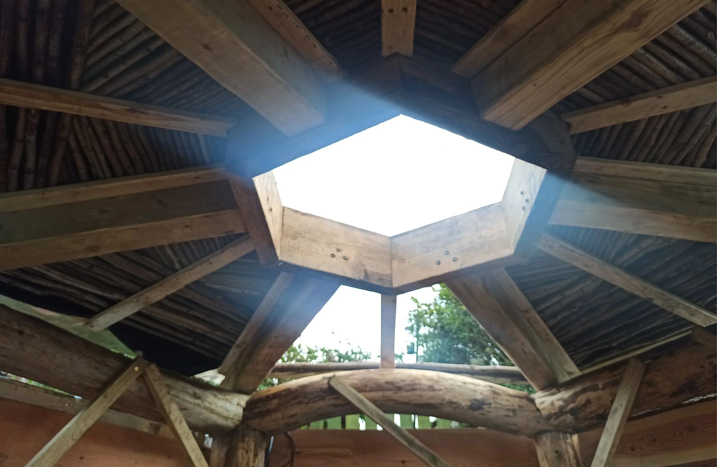 The centre of the sauna is a handcrafted roundwood frame sourced with local woodlands. The walls and ceiling comprise polycarbonate sheets with an adhered radiant barrier and clad with high quality larch cladding. The walls and celing panels are installed upon the supporting roundwood timber frame. Outside of the sauna there is an extensive covered changing area. The sauna is sited in a private garden but is used as an informal community sauna space.