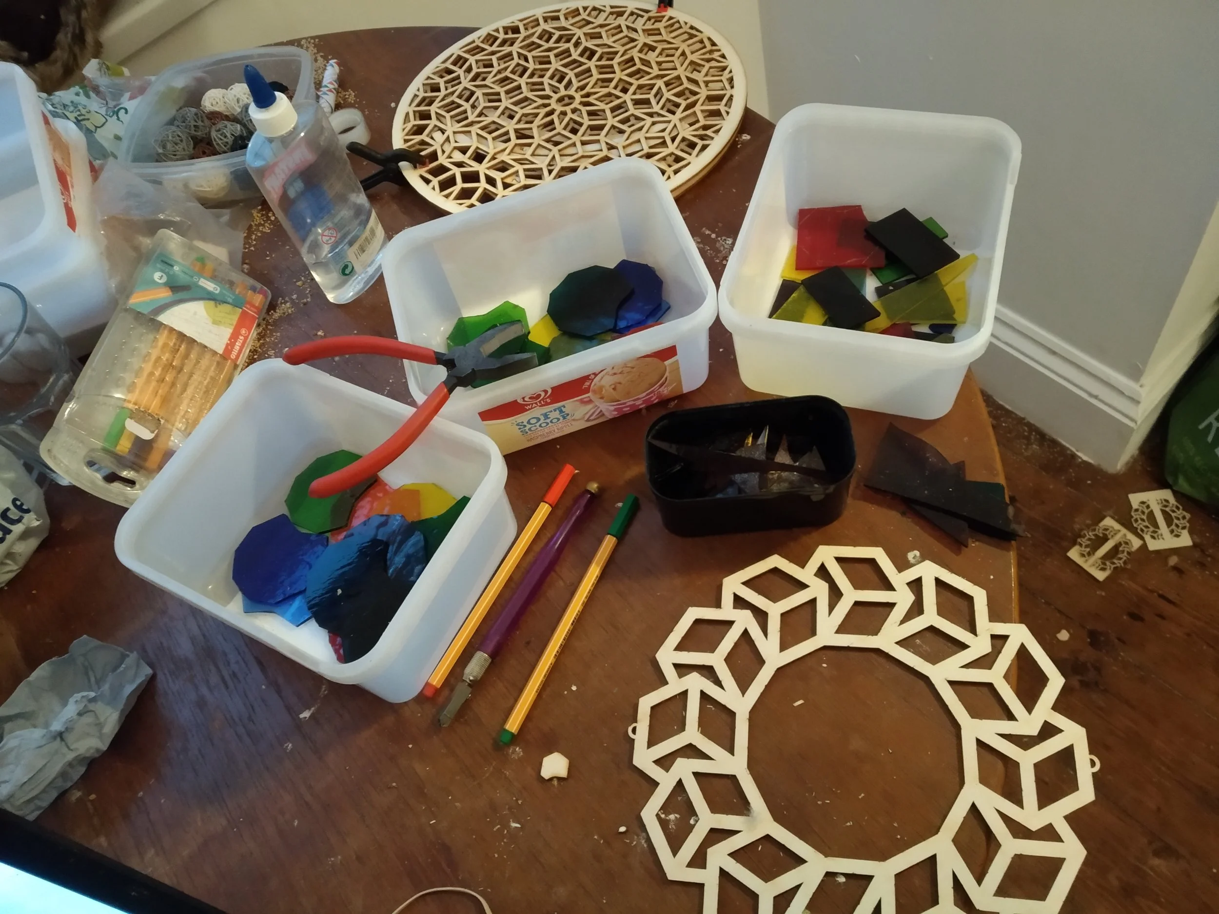 Once the glass pieces have been cut they have to adhered into place within the frame, alongisde any material used for the trim layer. This layer has to set before a final face layer can be added and aligned and also affixed.