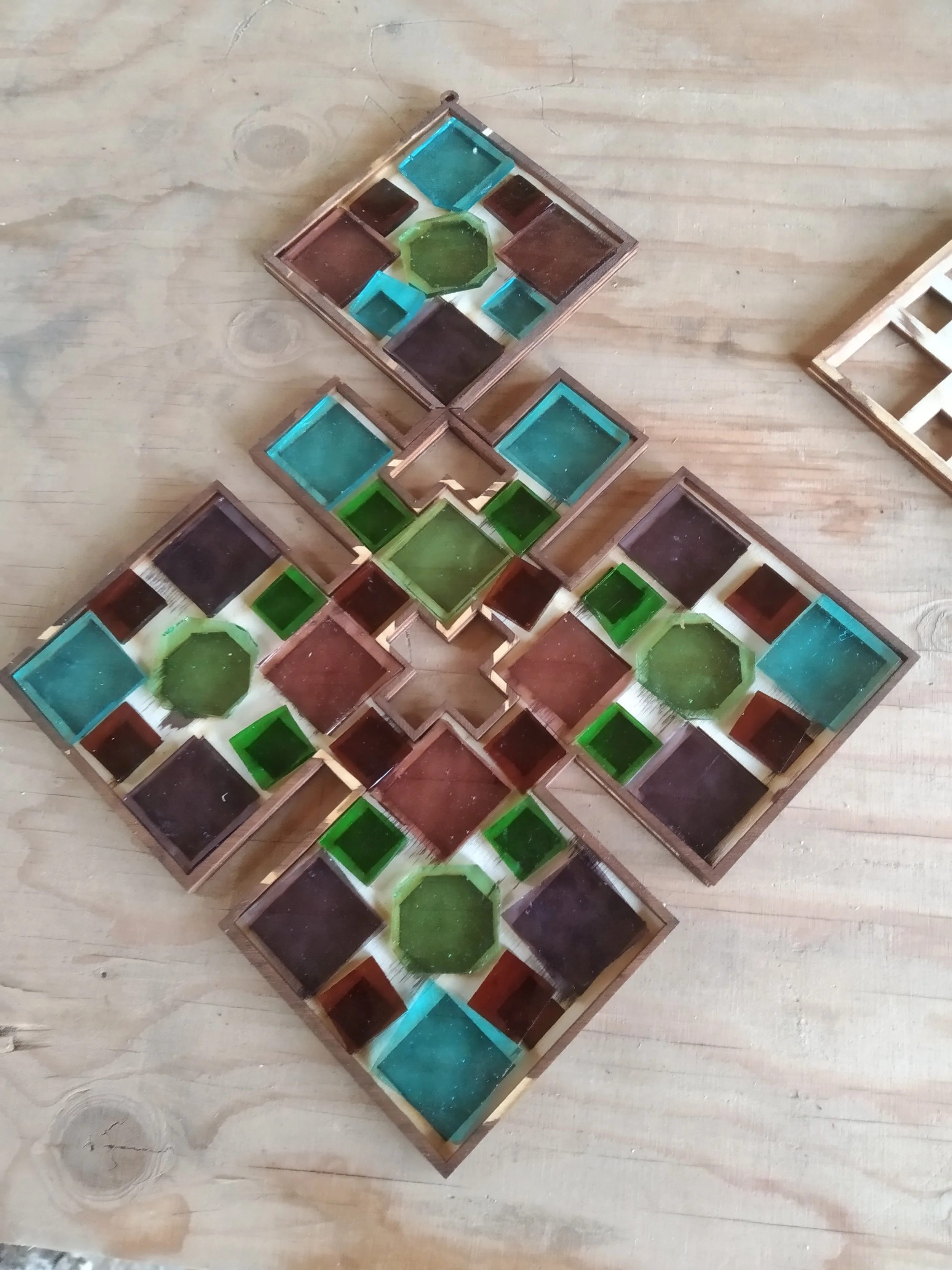 Unique art pieces made with a novel method combining wooden frames and stained glass