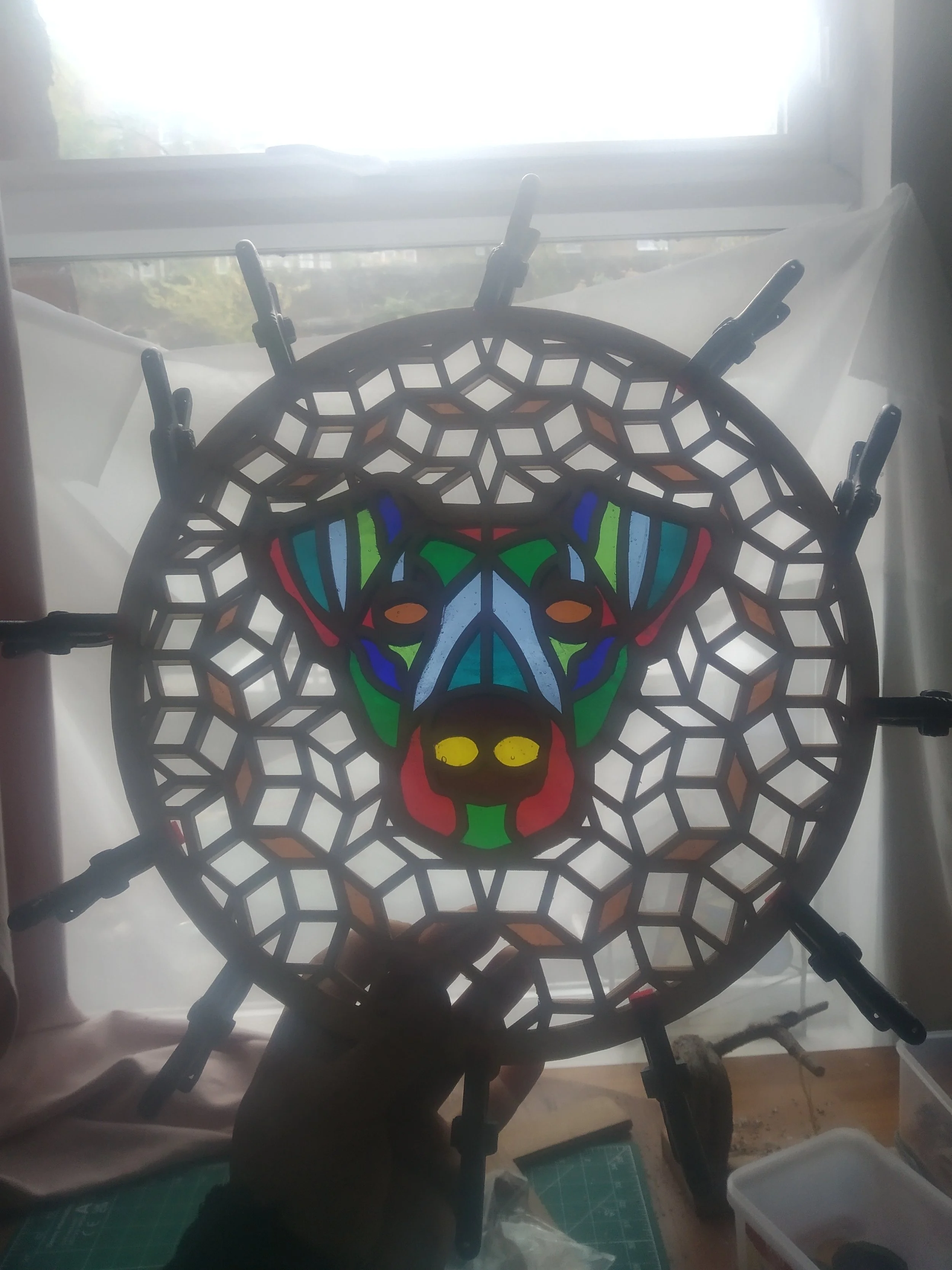 The frames comprise two visiable faces, mirrored to on another. There is an additional layer of material resting on the same plane as the stained glass, to create a trim layer to create a tidy visual edge and add rigidity to the final piece. These layers are adhesed to one another, held together with lots of tiny clamps and clips.